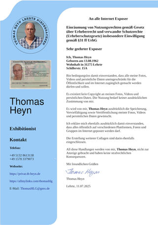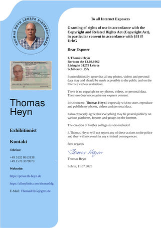 Einräumung von Nutzungsrechten gemäß Gesetz über Urheberrecht und verwandte Schutzrechte (Urheberschutzgesetz) insbesondere Einwilligung gemäß 831 ff UrhG. Ich, Thomas Heyn, Geboren am 13.08.1962, Wohn aft in 31275 Lehrte Schillerstr. 15A, bin bedingungslos damit einverstanden, dass alle meine Fotos, Videos und persönliche Daten uneingeschränkt für die Öffentlichkeit und im Internet zugänglich gemacht werden dürfen und sollen. Es existiert kein Copyright an meinen Fotos, Videos und persönlichen Daten. Die Nutzung bedarf keiner ausdrücklichen Zustimmung von mir. Es wird von mir, Thomas Heyn ausdrücklich die Speicherung, Vervielfältigung sowie Veröffentlichung meiner Fotos, Videos und persönlichen Daten gewünscht. Ich erkläre mich ebenfalls ausdrücklich damit einverstanden, dass alles öffentlich auf verschiedenen Plattformen, Foren und Gruppen im Internet gepostet werden darf. Die Erstellung weiterer Collagen sind darin ebenfalls eingeschlossen. All diese Handlungen werden von mir, Thomas Heyn, nicht zur Anzeige gebracht und haben keine strafrechtlichen Konsequenzen.
